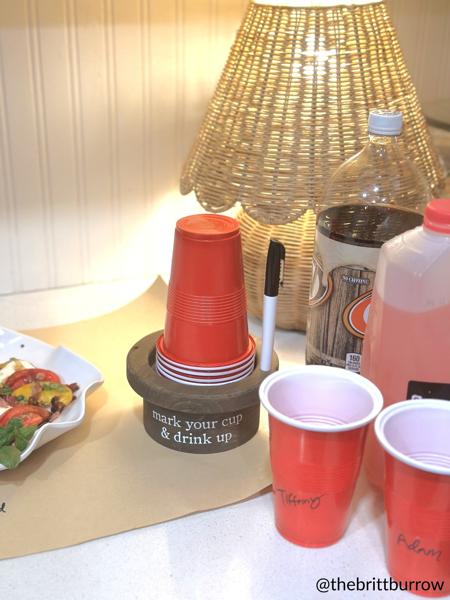 The Disposable Cup & Marker Set is a convenient and fun 3-piece set that includes ten plastic party cups and a permanent marker. The cups are neatly organized in a wooden base with a designated spot to hold the marker. Each cup has a capacity of 18 ounces and the base measures 3" x 5 1/2" in diameter. Perfect for parties and gatherings, this set allows guests to personalize their cups with the marker, ensuring that they can easily identify their drink. After the event, simply dispose of the cups for easy cleanup. Enjoy a personalized and hassle-free drinking experience with this Disposable Cup & Marker Set. Includes ten plastic party cups and a permanent marker.