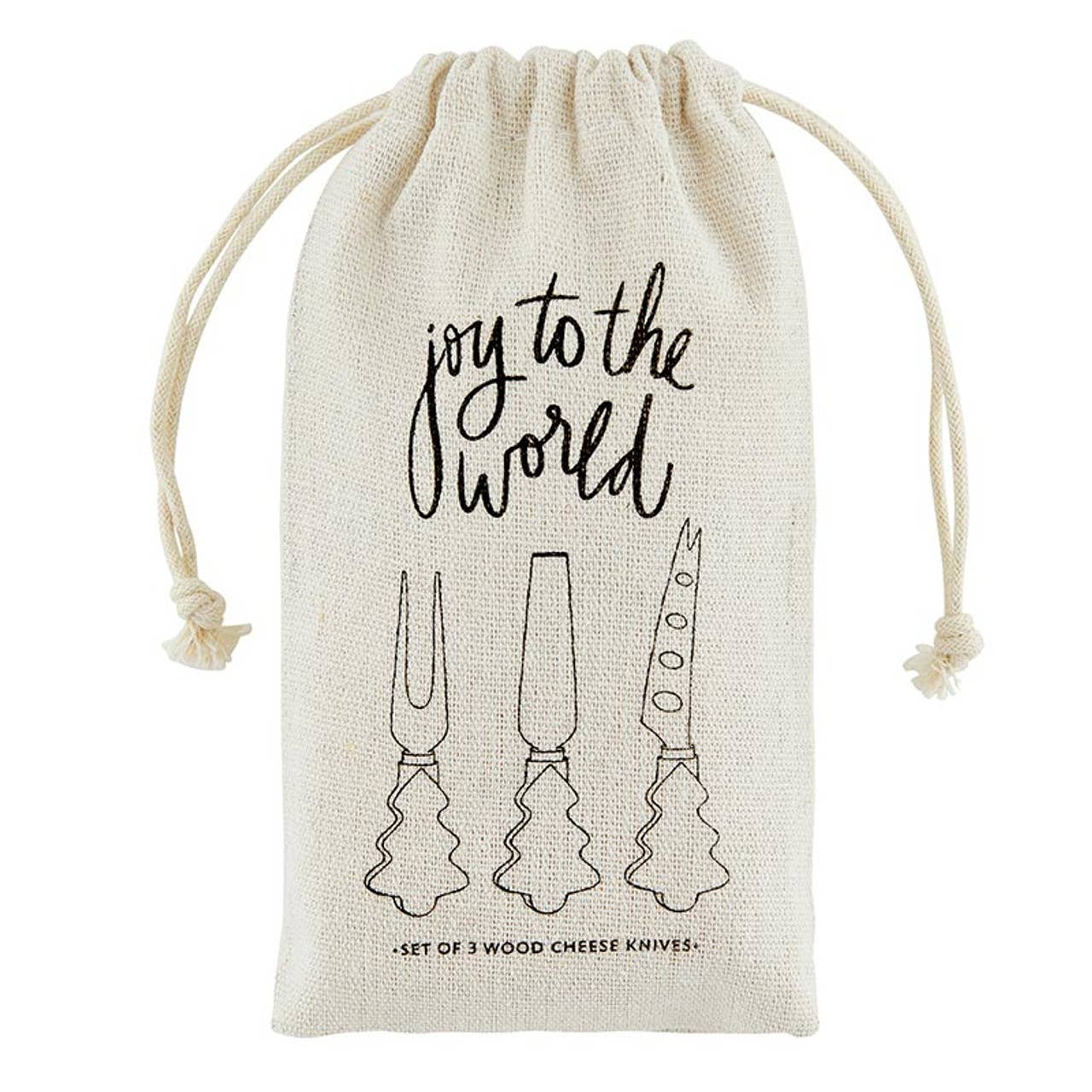 The perfect gift for a Holiday Hostess! These natural tree handled set of 3 cheese knives come in a stylish muslin bag for easy storage. Part of the Holiday Joy To The World Collection
